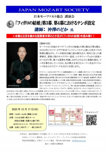 モーツァルト作曲のオペラ「フィガロの結婚」の第3幕及び第4幕を、2022年にセイジ・オザワ松本フェスティバルで上演した同オペラの映像を観ながら、テンポ設定を軸に読み解きます。時代に沿った演奏様式、登場人物のキャラクター設定、レチタティーヴォから音楽へのつながり等、様々な要素を考慮しながらどのように楽譜を読み、テンポを導き出していくのか。私が教えを受けたムーティ先生やペトレンコ先生とのエピソードも交えてお話します。